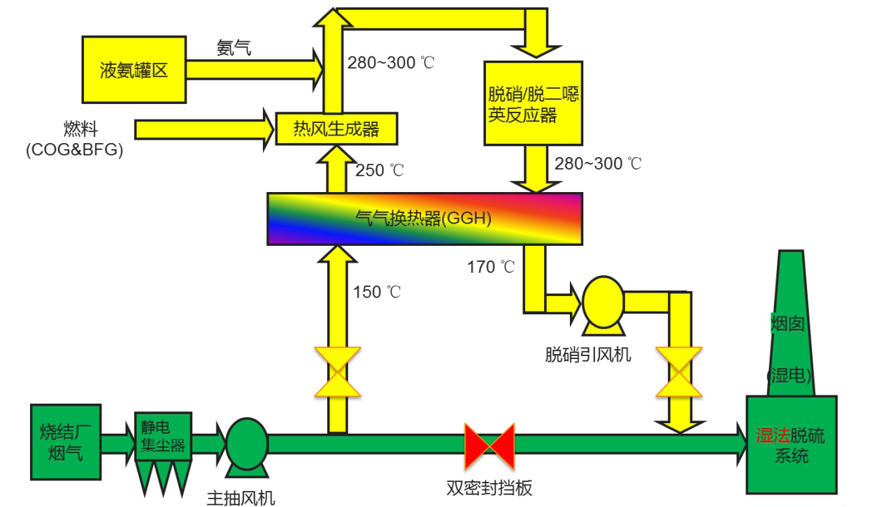 烧结烟气先经过GGH烟气换热器预热后,在烟道中与加热炉产生的高温烟气混合进一步升温,继而与稀释风机送入的氨空气混合气混合,进入SCR反应器进行脱硝、脱二噁英反应,之后烟气由引风机引入出口烟道排放。