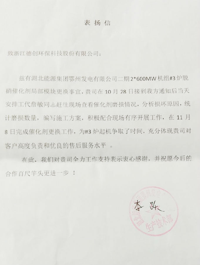 继10月下旬德创环保连收两封表扬信后,11月11日,公司再一次收到客户单位的表扬信。此次表扬信由湖北能源集团鄂州发电有限公司所写,主要感谢催化剂事业部工程服务部员工詹敏在湖北能源集团鄂州发电有限公司二期2*600MW机组#3炉脱硝催化剂局部模块更换工程项目中,能及时到达工程现场察看催化剂磨损情况,分析损坏原因,清点磨损数量,并编写施工方案,积极配合现场有序开展工作,仅用11天时间出色完成催化剂更换工作,为#3炉起机争取了时间,充分体现了德创环保优良的售后服务水平和员工高度负责的精神,赢得了客户方的认同与表扬。