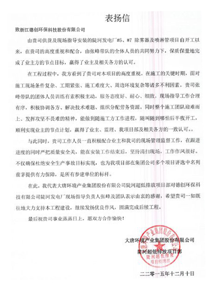 紧接着,大唐环境产业集团有限公司陡河超低排放项目部的表扬信也接踵而至。陡河发电厂5#、7#除雾器及喷淋管项目自开工以来,在设备制造事业部生产部主管张峰及团队的共同努力下,面对施工现场条件复杂、工期紧张等诸多不利因素,积极协调各方,解决技术难题,发挥攻坚不畏难的精神,保质保量完成了业主方的节点目标,赢得了业主及相关各方的认可。客户单位还特别强调,德创环保工作人员的付出与努力不仅确保杜绝安全生产事故目标实现,也为项目部在集团公司多个项目评选中名列前茅提供有力保障,是所有参建单位的杆标。