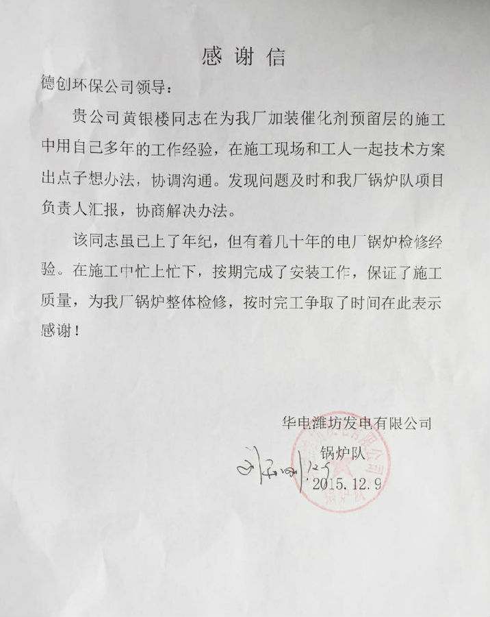 12月9日至10日,德创环保仅两天就收到三封表扬信。12月9日,华电潍坊发电有限公司发来表扬信。表扬信中,华电潍坊发电有限公司对催化剂事业部工程服务部副经理黄银楼在为客户单位加装催化剂预留层的施工过程中,凭借自己工作经验与技术技能,与工程现场的工人一起合作,想方案出点子,帮助施工工程如期完成安装工作,保证了施工质量,为按时完工争取了时间。