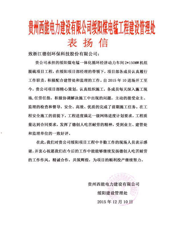 贵州西能电力建设有限公司绥阳建设管理处也对德创环保予以了肯定。在绥阳煤电锰一体化循环经济动力车间2*150MW机组脱硫项目工程中,德创环保员工认真履行工作职责,积极配合建管处和监理的工作,在工程安全施工的前提下,工程进度满足一级网络进度计划要求,工程质量达到合同要求,受到业主、建管处和监理单位的一致好评。对此,贵州西能电力建设有限公司对德创环保在绥阳项目工程中辛勤工作的现场人员表示感谢,并衷心祝愿在今后的工作中能精诚合作,共筑辉煌。