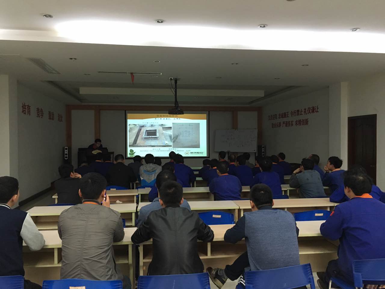 此次案例总结会以挡板门、皮带机、球磨机、合金件、包装箱等产品为例,对产品过程检验及项目现场质量问题案例进行总结分析。会议中,品管部员工赵峰以PPT的形式回顾了以上产品的现状,并提出相应的工艺改进方案;而工程服务部员工蓝宣勇则对产品在工程现场安装的操作行为进行汇总,对现场安装提出新的要求,并对每个产品的后续防范及现场安装违规处罚作细致讲解。