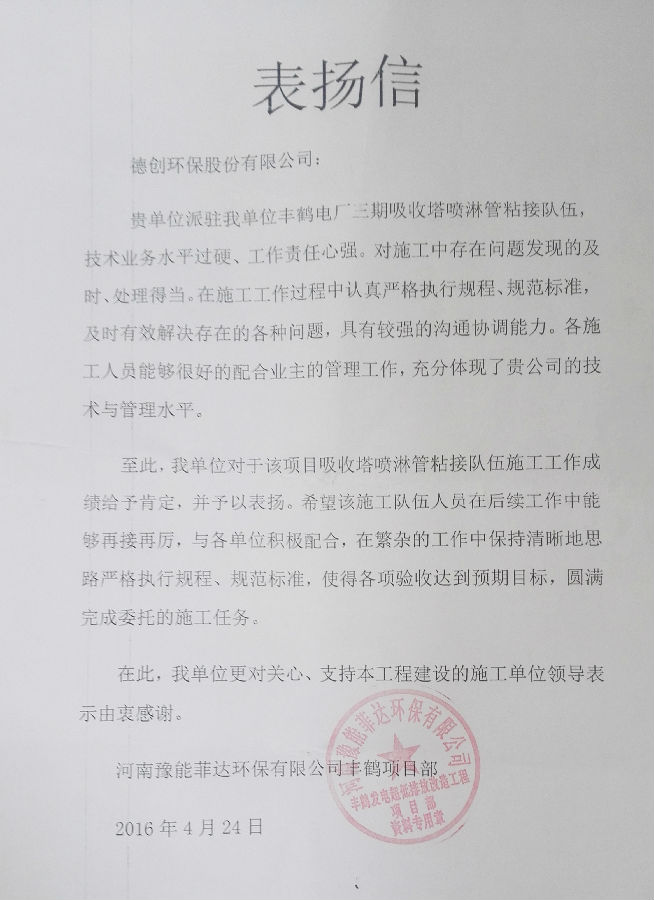 近日,德创环保收到了来自河南豫能菲达环保有限公司丰鹤项目部的表扬信。在鹤壁丰鹤2×600MW脱硫项目中,德创环保派遣的喷淋管安装人员技术水平过硬、工作责任心强,能及时发现施工中存在的问题并处理得当,同时在施工过程中严格执行操作规程,具有较强的沟通协调能力,充分体现了德创环保的技术与管理水平。对此,河南豫能菲达环保有限公司丰鹤项目部对德创环保喷淋管安装人员予以肯定和表扬,希望在后续工作中能再接再厉,使各项验收达到预期目标,圆满完成委托的施工任务。