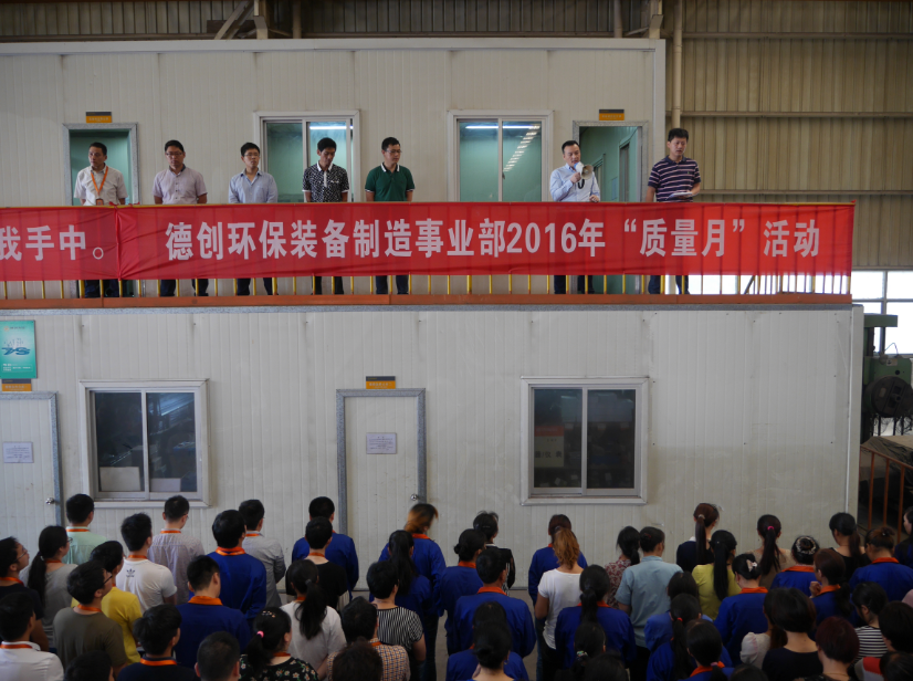 5月31日,德创环保装备制造事业部“质量月”活动总结大会在公司二车间举行。装备制造事业部全体一线员工参加此次启动大会,公司副总裁马总、事业部各领导均到场并作重要讲话。