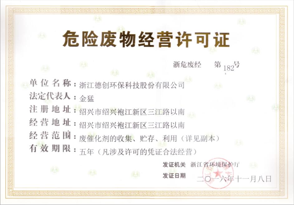 近日,德创环保获得了由浙江省环境保护厅颁发的“危险废物经营许可证”,经营范围包括对废催化剂的收集、贮存和利用。该证的获得,将进一步提升德创环保对废催化剂的处理能力,有助于公司尽快实现催化剂生产销售到回收再利用的绿色循环经济模式。