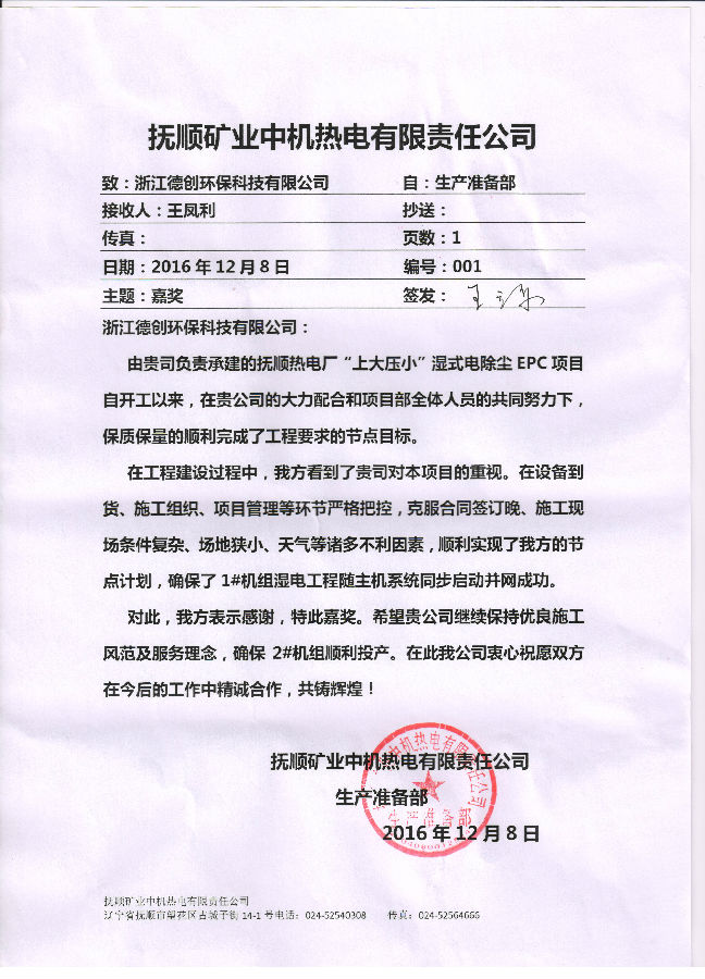 近日,德创环保收到了一封来自于抚顺矿业中机热电有限公司生产准备部的表扬信,信中提及在德创环保负责承接的抚顺热电厂“上大压小”湿式电除尘器EPC项目自开工以来,在公司的大力配合和项目部全体人员的共同努力下,保质保量顺利完成了工程要求的节点目标。在工程建设过程中,德创环保在设备到货、施工组织、项目管理等环节能做到严格把控,克服合同签订晚、施工现场条件复杂、场地狭小、天气等诸多不利因素,顺利实现客户方节点计划,确保了1#机组湿电工程随主机系统同步启动并网成功。对此,客户方表示感谢,希望德创环保能继续保持优良施工风范及服务理念,在接下来的工作中精诚合作,共铸辉煌。