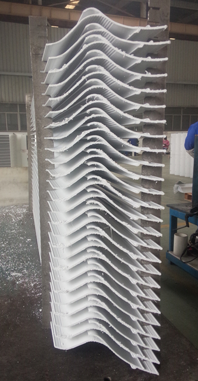 上述叶片我公司已报实用新型,其结构特征为:湿烟气经过PP叶片时,所夹带的极细小液滴与叶片上的多处小钩进行碰撞,被吸附聚集成大液滴,受重力影响,与烟气分离。解决了除雾器除雾效率低的难题。