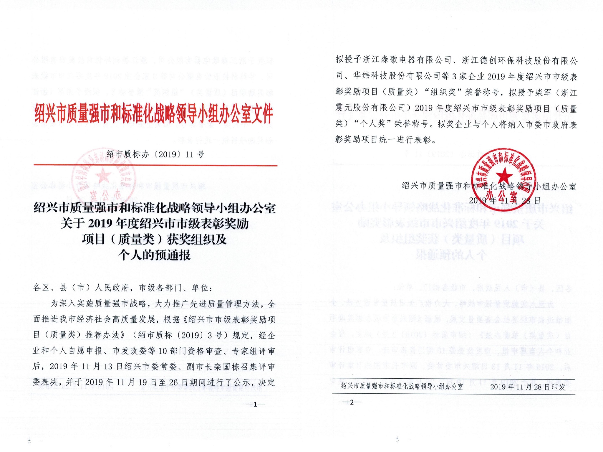 近日,绍兴市质量强市和标准化战略领导小组办公室发布了《关于2019年度绍兴市市级表彰奖励项目(质量类)获奖组织及个人的预通报》,公布了2019年度绍兴市市长质量奖获奖单位,在三家荣膺的公司中,德创环保位列其中!