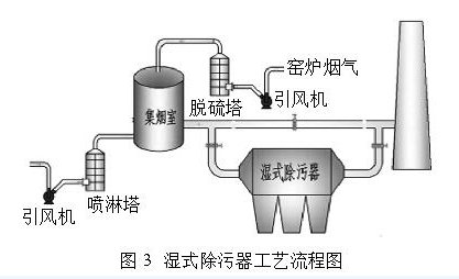 窑炉烟气中的含湿量偏大,如果采用布袋除尘器,虽然采用纯PTFE耐腐蚀滤料,但粘性粉尘会粘到滤袋表面,造成糊袋现象导致除尘器不能正常工作,而湿式除污则不存在这个问题,粘性物料先进入湿法脱硫吸收塔内脱硫、预除尘,再进入湿式除污器内最终彻底脱除。