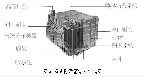 湿式除污器由进口封头、气流分布装置、底梁、灰斗、阳极系统、阴极系统、壳体、出口封头、喷淋清洗系统、高压电源装置、灰水处理系统、电气控制系统等部分组成。湿式除污器结构组成如图2所示。