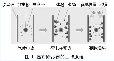 湿式除污器工作原理与传统电除尘器相似,依靠的都是静电力,所不同的是工作环境为一“湿”一“干”。
