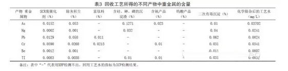 以典型的SCR废催化剂回收工艺中各种产物中的重金属含量来说明其在回收流程中的赋存情况,具体数据见表3。从表3的数据可知,上述重金属均不会在钨酸的产品中沉积;而钒产品中夹带的重金属虽然种类多,但含量均不高,若将其进一步深加工还可以提升品质;富钛料中的重金属种类和含量完全不影响其作为钛原料的后续加工。除尘积灰、含硅砷磷的沉淀渣和二次有毒沉淀为主要的重金属富集载体,因而必须送危废填埋厂进行有效处置。回用工艺水中各类重金属的含量均很低,可满足工艺用水要求,不会对生产过程的质量控制产生负面影响。