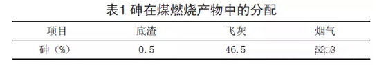 煤炭是一种复杂的天然矿物,各种煤中砷的含量变化很大,一般为每公斤3~45mg。煤中的砷多数以硫化砷或硫砷铁矿(FeS2˙FeAs2)等形式存在,小部分为有机物形态。由于煤本身不均匀的自然特性,因此我国煤中砷的变化也较大,砷含量在0.5~80ppm,一般来说,我国西南部,特别是贵州煤中的砷含量非常高。煤在燃烧过程中由于高温和强烈的氧化作用,会释放出砷。砷在煤中的赋存状态不同,燃煤过程中砷释放的难易程度也不同。砷在燃烧产物中的存在形态决定了其对环境的影响程度。若把燃煤产物分成底渣、除尘器飞灰和进入大气的烟气三个部分,砷在飞灰中富集的浓度明显高于在底灰中的浓度,而且随着煤灰粒径的变小,砷在其中富集的浓度增大,即在灰中的含量与煤灰的粒径成反比。根据在某热电厂选取3个典型样品,计算出砷在燃烧产物中的分布情况[5],见表1。