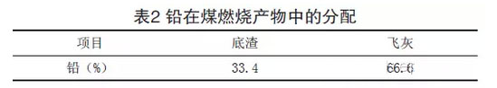 煤中的铅是大气铅污染的来源之一,煤燃烧后产生20%~25%的灰分,煤中的大部分铅在燃烧过程气化后凝结于飞灰中形成铅尘。我国煤中铅含量的平均值为15.55mg/kg,其燃烧产物中铅的分布情况如表2所示。