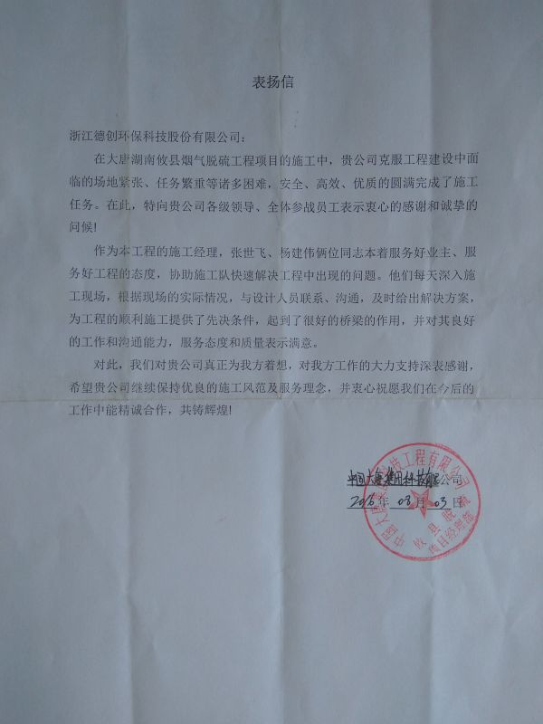 近日,在大唐湖南攸县烟气脱硫工程项目的施工中,德创环保工作人员克服工程建设中场地紧张、任务繁重等困难,安全、高效、优质完成施工任务。其中,作为工程施工经理的张世飞、杨建伟两名员工本着“服务好业主、服务好工程”的宗旨,每天深入施工现场,根据现场的实际情况与设计人员联系、沟通,及时给出解决方案,并协助施工队快速解决工程中出现的问题,为工程的顺利施工起到很好的沟通作用,深受业主方的肯定与认同。为此,大唐集团科技工程有限公司攸县脱硫项目经理部写表扬信向德创环保各级领导及项目工作人员表示感谢与诚挚的问候。