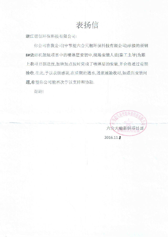 近期,德创环保收到了一封来自中节能六合天融新钢项目部的表扬信。德创环保在中节能六合天融环保科技有限公司承接的新钢8#烧结机脱硫项目中的喷淋层安装中,现场安装人员为跟上业主方项目部进度,加班加点按时完成了喷淋层的安装,合格通过前期验收,在此业主方予以了表扬与感谢。