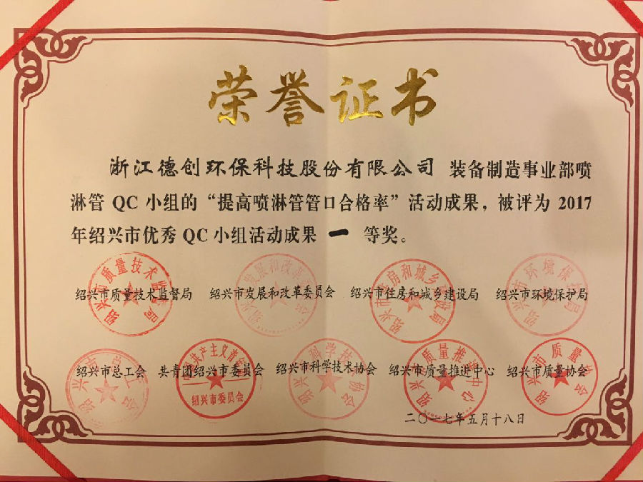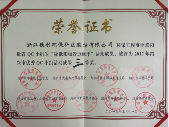 近日,绍兴市质量协会举办的2017年绍兴优秀质量管理小组(QC小组)活动评选中,德创环保频获佳绩,其中装备制造事业部喷淋管QC小组的“提高喷淋管管口合格率”喜获优秀QC小组活动成果一等奖、环保工程事业部阳极管QC小组的“降低阳极管返修率”荣获优秀QC小组活动成果三等奖。