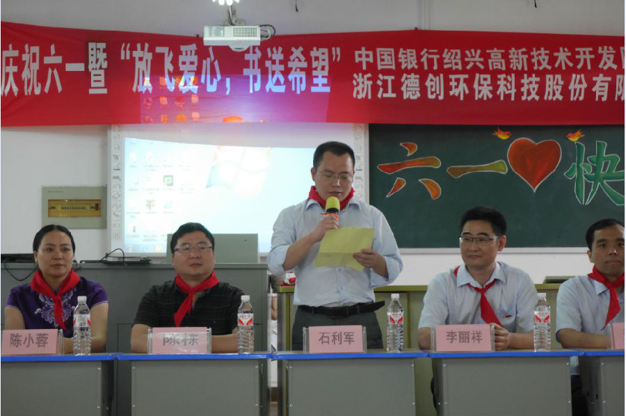6月1日,庆祝六一暨“放飞爱心 书送希望”中国银行绍兴高新支行与德创环保图书捐赠仪式在绍兴新桥小学举行。德创环保总裁办经理石利军、行政管理中心经理陈栋出席仪式。此次捐赠,德创环保与中国银行高新支行在六一儿童节这个特殊的节日里,为小朋友们捐赠各类图书,奉上一份希望与爱心。