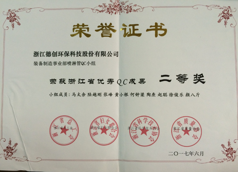 6月30日,在浙江省质量协会举办的2017年浙江省优秀质量管理小组(QC小组)活动评选中,德创环保装备制造事业部喷淋管QC小组的“提高喷淋管管口合格率”表现出色,喜获浙江省优秀QC小组活动成果二等奖。