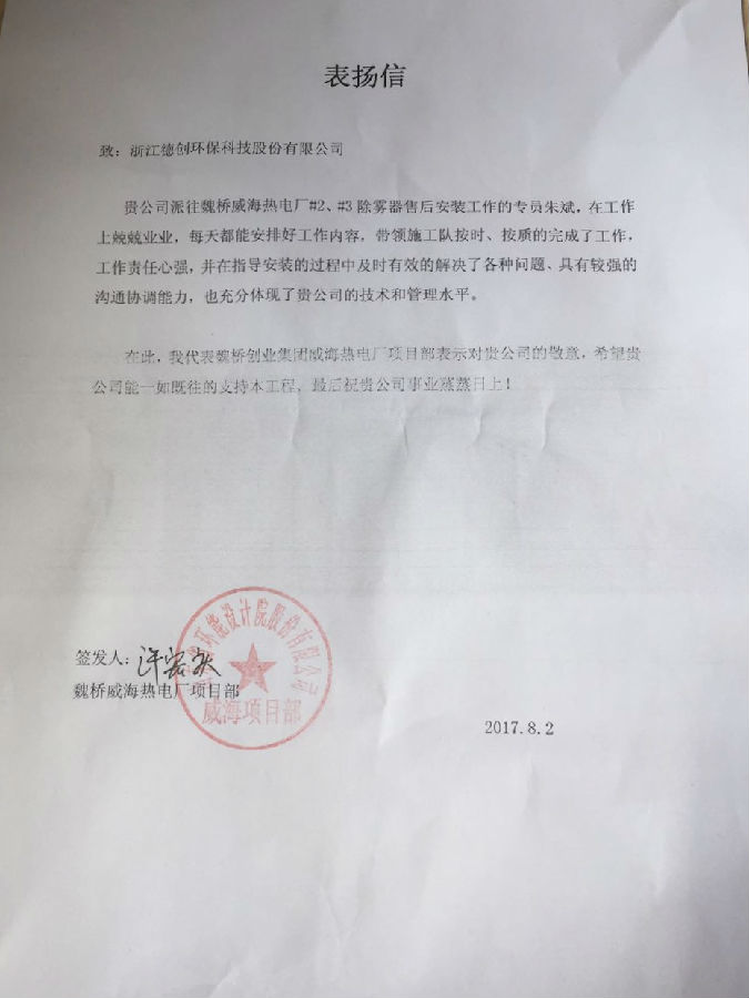 近期,德创环保收到了一封来自山东环能设计院威海项目部的表扬信。信中指出,在魏桥威海热电厂#2#3除雾器的售后安装中,公司员工朱斌在工作中兢兢业业,每天都能安排好工作内容,带领施工队按时、按质地完成了工作,并在指导安装的过程中及时有效的解决了各种问题,具有较强的沟通协调能力,赢得了业主方的高度称赞。