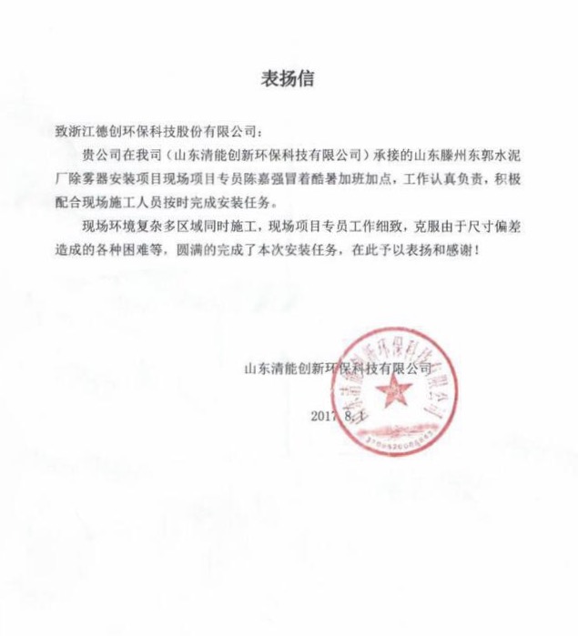 近期,德创环保收到了一封来自山东清能创新环保科技有限公司的表扬信。信中指出,在山东滕州东郭水泥厂除雾器安装项目中,公司员工陈嘉强冒着酷暑加班加点,克服各种困难,圆满完成了此次安装任务,赢得客户的表扬与感谢