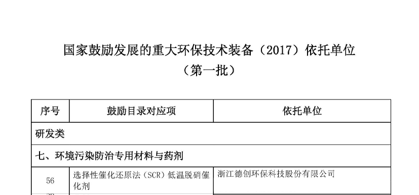 德创环保凭借“选择性催化还原法(SCR)低温脱硝催化剂“成功入选,成为国家鼓励发展的