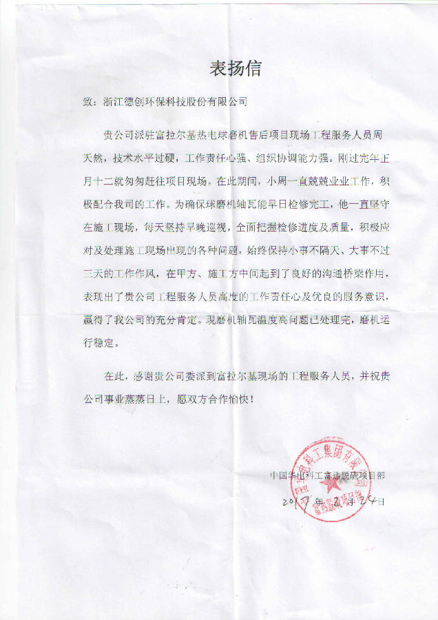 首先是中国华电科工富热脱硫项目部发来的表扬信。表扬信中指出,德创环保富拉尔基热电球磨机售后项目现场工程人员周天然,技术水平过硬,能积极配合业主工作,及时应对及处理施工现场出现的各种问题,做到“小事不隔天、大事不过三天”,在甲方、施工方中间起到了良好的沟通桥梁作用,表现出德创环保工程服务人员高度的工作责任心及优良的服务意识,赢得了业主的充分肯定。