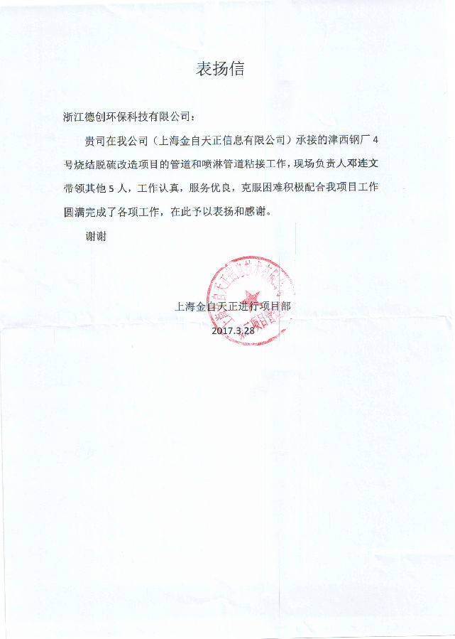 除此之外,上海金自天信息有限公司项目部也特发表扬信。在德创环保承接的津西钢厂4号烧结脱硫改造项目的管道和喷淋管道粘接工作中,德创环保现场负责人邓连文等同志工作认真,服务优良,克服困难积极配合业主项目工作,圆满完成了各项任务,特在此予以表扬与感谢。
