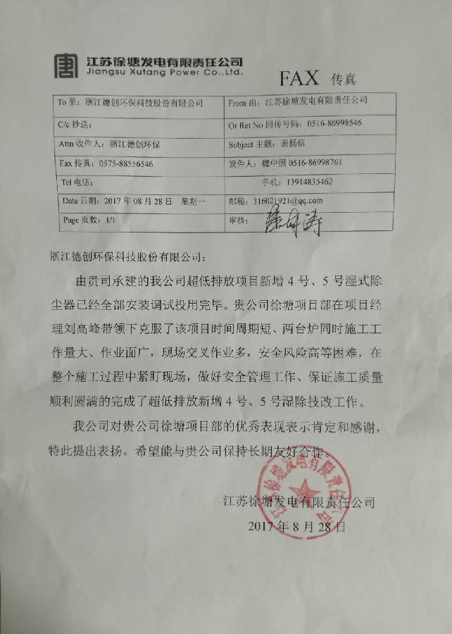 近期,德创环保收到了一封来自江苏徐塘发电有限责任公司的表扬信。德创环保在徐塘超低排放项目新增的4号、5号湿式除尘器已全部安装调试完毕,施工人员在我公司徐塘项目部经理刘高峰带领下克服了该项目时间短、工作量大、现场交叉作业多等困难。在整个施工过程中德创环保紧盯现场,做好安全管理工作、保证施工质量并圆满完成了超低排放新增4号、5号湿除技改工作。在此业主方予以了表扬与感谢。