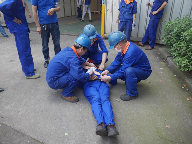 高温酷暑天来临,考虑到车间一线员工易发生中暑现象,特设置“中暑休克急救”环节。当出现这种状况,首先将中暑者快速抬离高温区,在通风处,立即脱去上衣并用带酒精的毛巾为其擦拭身体降温。