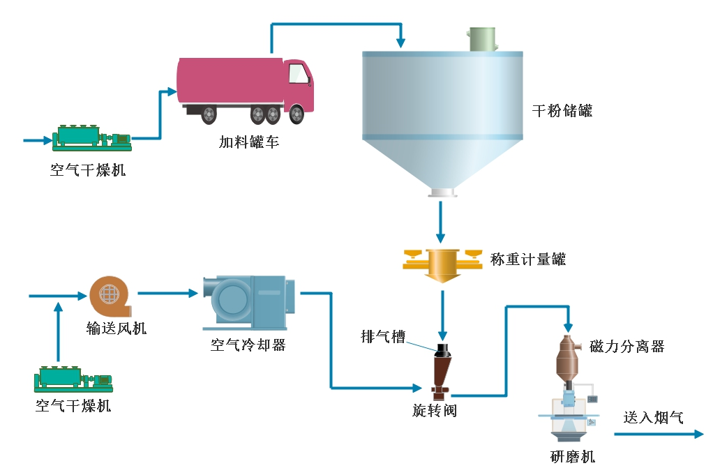 干粉吸附剂注射系统如图1所示。如果当地空气湿度较大,需增加气源干燥装置。如果输送粉料粒度较大,可增加研磨装置以减小粉料粒度增加反应面积。该系统运行过程如下: