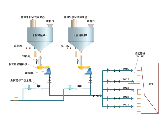 该注射系统主要设备有:罐顶过滤器、干粉储罐、振动送料器、称重槽、旋转阀、槽顶过滤器、罗茨风机、分配器、喷嘴、DSI系统配电控制柜、过滤器开关阀、秤重槽出入料控制阀 、干粉储罐微正压气动阀、料位计、调压过滤器、干粉储罐安全阀、储气罐、压力表。具体流程见图2。