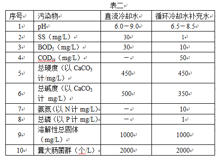 电厂用水主要为循环冷却水补水及锅炉补给水水源。循环冷却水补水水质可参照以下表二水质标准。