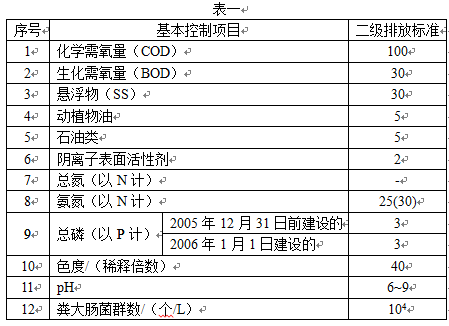 新疆所建的城市污水处理厂大多数设计出水水质为《城镇污水处理厂污染物排放标准》(GB18918-2002)中的二级标准,具体水质指标如表一。