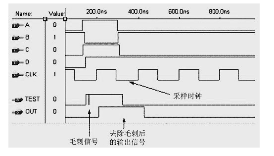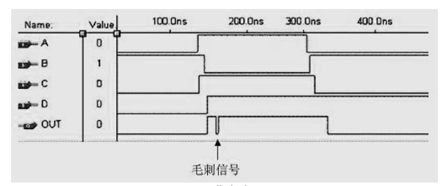 即使是在最简单的逻辑运算中,如果出现多路信号同时跳变的情况,在通过内部走线以后,也一定会产生毛刺。如上图所示,A、B、C、D四个输入信号经过布线延时后,高低电平变换不是同时发生的,这导致输出信号出现了毛刺。