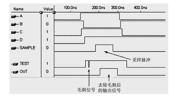 但是以上方法并不能完全消除毛刺,所以我们需要采取“采样”的方法。一般冒险都出现在信号发生电平转换的时刻,也就是说毛刺是在输出信号产生的时候出现的,而在输出信号保持的期间不会有毛刺产生,所以我们可以通过在输出信号保持期间对其进行采样,从而消除毛刺的影响。