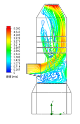 图5为导流环边长400mm时吸收塔内烟气速度分布。增加导流板边长为400mm,覆盖率为13.4%,此时导流环的导流作用显著,壁面烟气流速较低,烟气爬壁现象明显得到改善。