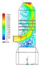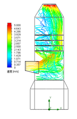 图7为导流环边长100mm时吸收塔内烟气流线分布,由于导流环覆盖率3.4%,其导流效果不明显,壁面烟气流速仍然较大,流线分布明显,因此导流环边长较小时,无法起到较好的导流效果。