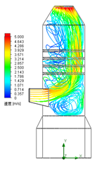 图11为导流环边长500mm时吸收塔内流线分布。当导流板覆盖率为16.6%时,与覆盖率为13.4%时均能达到设计导流环的目的,但在吸收塔径不变的前提下,导流环覆盖率越大,喷淋管喷淋区面积越小,因此在达到改善烟气分布,避免偏流的目的同时,不易设计覆盖率较大的导流装置。