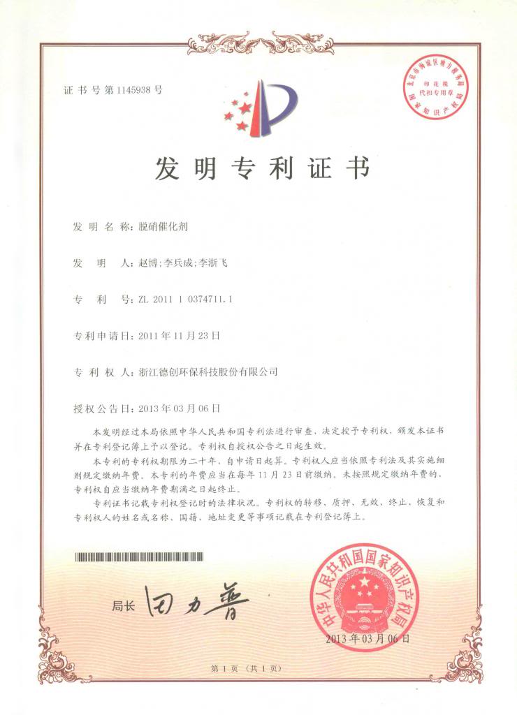 脱硝催化剂专利授权喜报 2014-06-02 09:50:14 2012年3月6日,公司核心产品脱硝催化剂获得国家知识产权局授予发明专利证书。该专利的授予,提升了公司烟气脱硝技术领域的自主创新能力。促进了公司脱硝催化剂的市场竞争力!